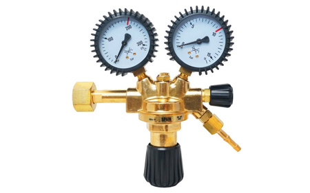 Profesjonalny, jednostopniowy reduktor butlowy do bar z dwoma manometrami do odczytu ciśnienia w butli i ciśnienia roboczego.